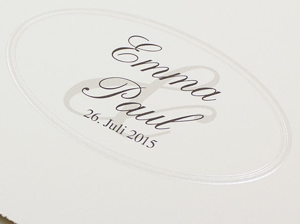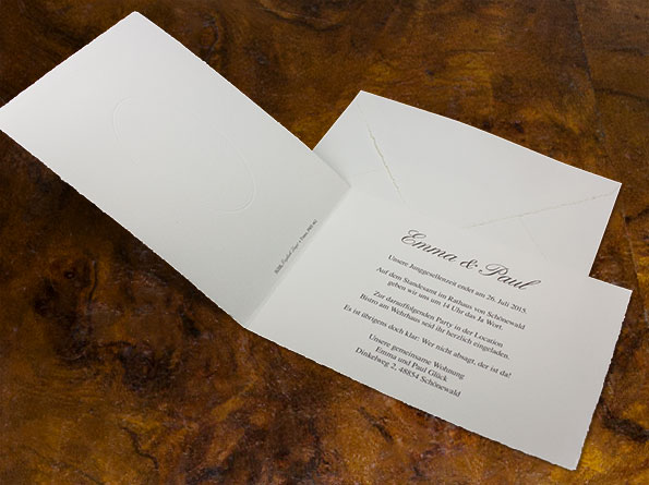 Eine ovale, leicht seidenglänzende Blindprägung auf der Vorderseite verleiht den Karten eine besonders elegante Note. Die Einladungen werden nach links aufgeklappt und mit passenden Bütten-Umschlägen geliefert – perfekt für eine stilvolle Hochzeitseinladung mit traditionellem Charme.
