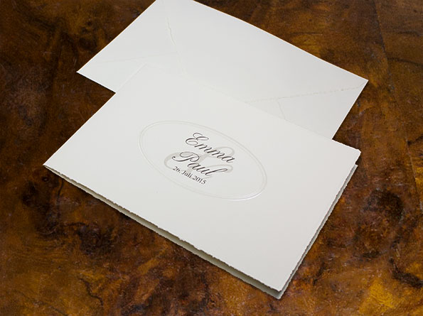 Cremefarbene Karte aus Büttenpapier mit typischem Büttenrand und ovaler Prägung in der Mitte.