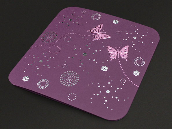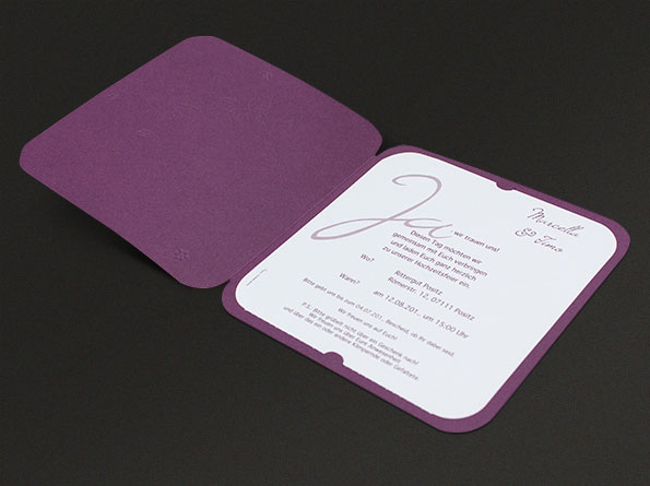 Gefertigt sind die Einladungen aus hochwertigem, lila durchgefärbten Karton. Lila und silbern glänzen