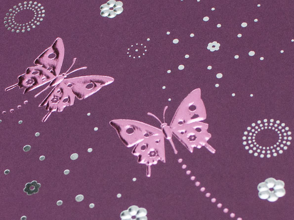 Blumen tanzende, lila Schmetterlinge, geben diesen Karten eine luftige, leichte Erscheinung.