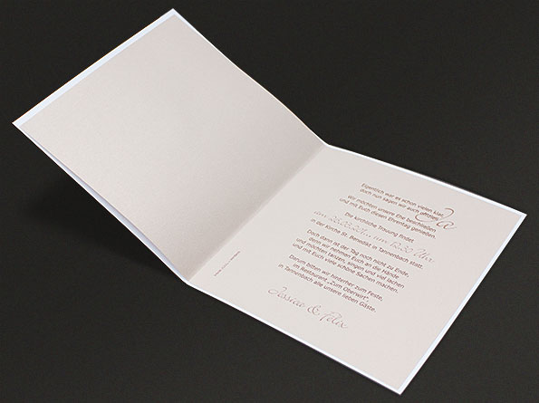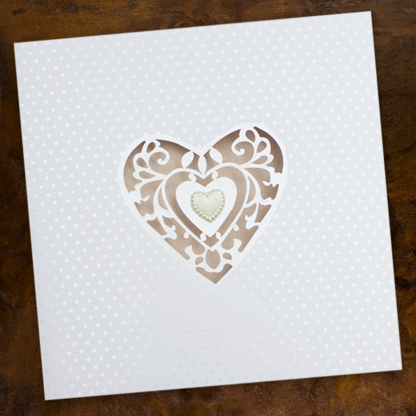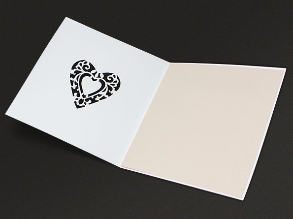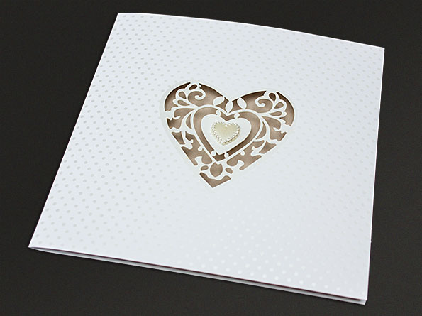 Liebliche Einladungskarten mit filigranem, per Laser Cut ausgeschnittenem Herz, auf welches ein
