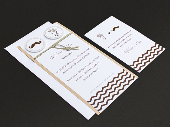 Große Hochzeitseinladung mit zwei aufgeklebten Buttons und angknüpfter Kordel, sowie eine kleinere Zusatzkarte. Beide im Vintage-Style gestaltet.