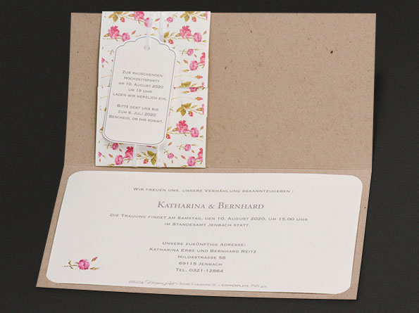 Ihr sucht eine romantische Vintage-Hochzeitseinladung, die Euren großen Tag perfekt ankündigt? Diese liebevoll gestalteten Karten bestehen aus hellem Kraftkarton und sind mit einer zauberhaften Blumenbanderole, einem weißen Bändchen und zwei Anhängern zum Anknüpfen verziert.