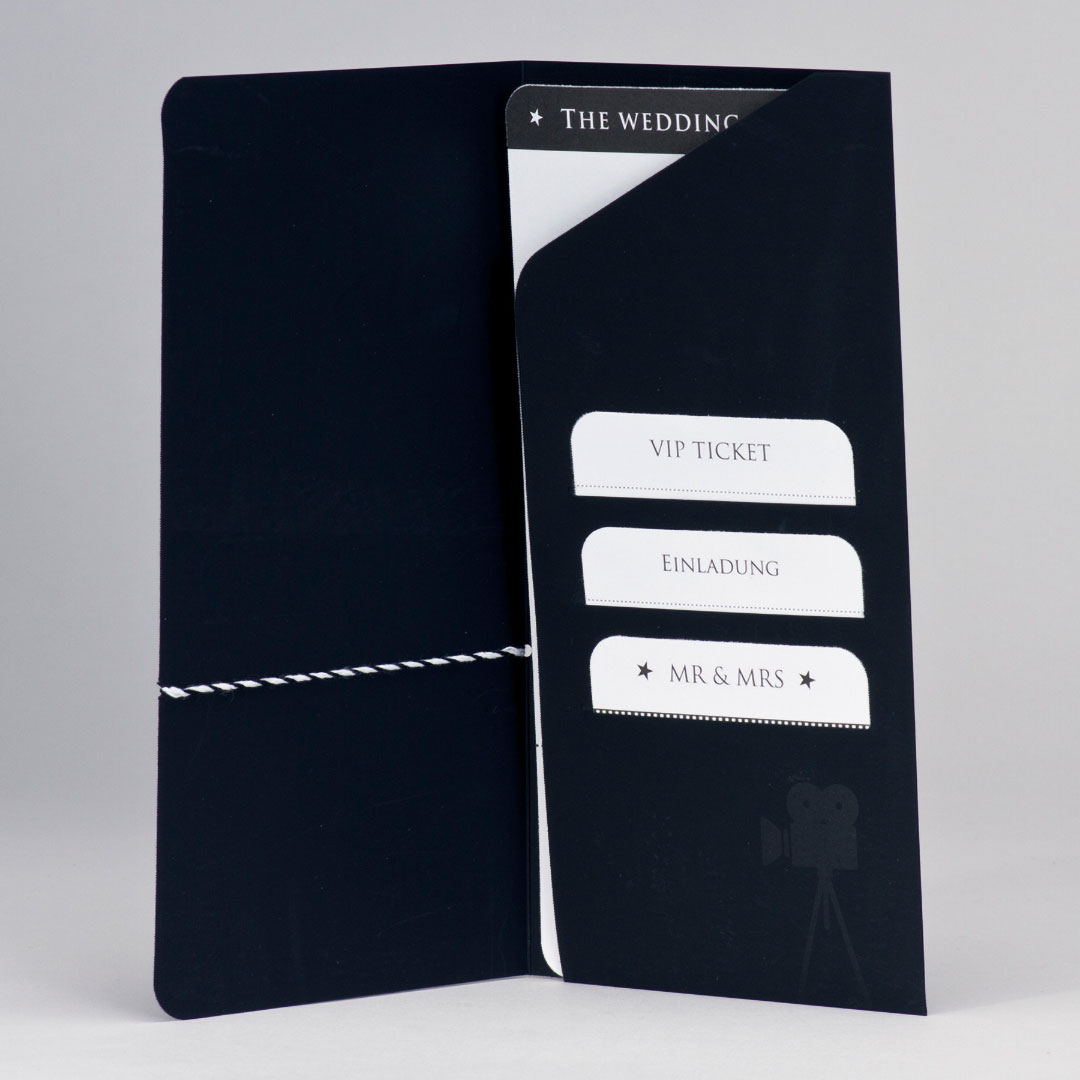 Originelle Einladungskarten zur Hochzeit, gearbeitet als Pocketkarte. Eine große Karte, sowie drei kleinere Zusatzkärtchen bieten viel Platz für Informationen. Alles in ausgefallenem Design gestaltet. Viele kleine Symbole lassen Filmset-Atmosphäre entstehen. Ein Highlight ist Euer persönliches, in die Karte gedruckte Foto. Natürlich kann das auch wegbleiben, wenn Ihr das Wünscht. Hergestellt sind diese Hochzeitseinladungen aus mattem schwarzen Karton, auf welchem eine seidig-glänzende Filmkamera aufgedruckt ist. Noch zu erwähnen bleibt eine Kordel, an die ein kleiner Anhänger geknüpft werden kann. Die Karten werden nach links aufgeklappt.