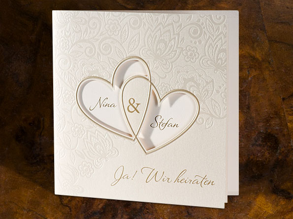 Ihr möchtet Eure Hochzeitseinladungen elegant und romantisch gestalten? Diese hochwertigen Karten sind die perfekte Wahl! Gefertigt aus perlmuttartig schillerndem Karton, verzaubern sie mit zwei goldenen, geprägten Herzen und einem zarten Blumenmuster.