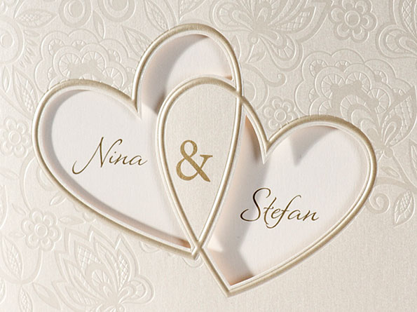 Elegante Hochzeitseinladungen mit zwei Herzen, Sichtstanzungen und Blumenmuster.
