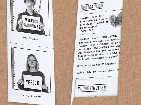 Trendige, als Mappe gestaltete Hochzeitseinladungen, mit welchen Ihr auf besonders originelle Art zu Eurem Hochzeitsfest einladen könnt.