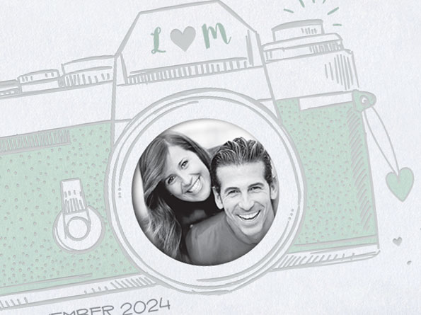 Ladet doch einfach mit Eurem persönlichen Foto zur Hochzeit ein. Diese fröhlich gestalteten Hochzeitseinladungen bieten sich dafür an. Gefertigt als Umschlag, in den ein Texteinleger gesteckt wird. Die Konturen der gezeichneten Kamarea sind als silberner Foliendruck ausgeführt. Durch eine Stanzung im „Objektiv” der Kamera ist Euer Bild auf der Aussenseite prominent sichtbar. Das Materiel dieser Hochzeitseinladungen ist schillernder Perlmuttkarton. Die Einladungstexte und die Abbildung drucken wir auf den Einleger.