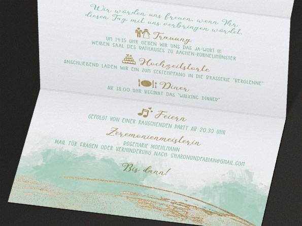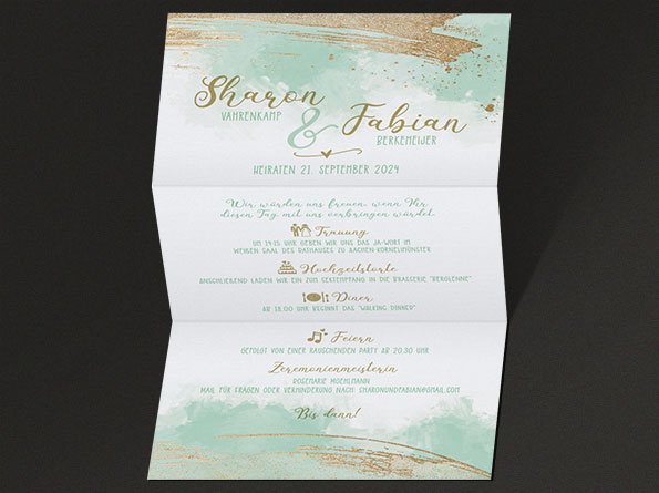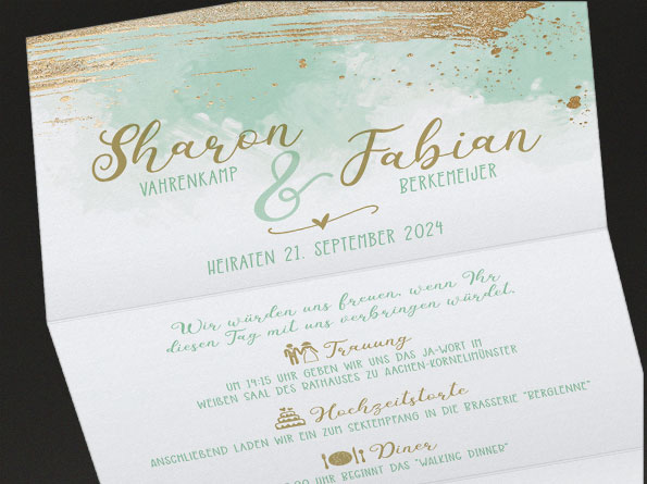Moderne Hochzeitsfeier in Mintgrün? Dann sind diese Hochzeitseinladungen vielleicht passend für Euch. Eine kreative künstlerische Gestaltung kommt hier durch die gelungene Kombination von Aquarell und goldenem Foliendruck geschmackvoll zur Anwendung. Aufgebracht auf schillerndem Metallic-Karton. Der Leporello-Falz unterstützt das pfiffige Erscheinungsbild dieser besonderen Einladungen zur Hochzeit.