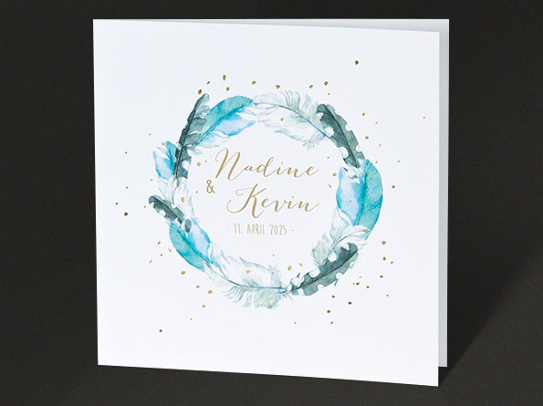 Verspielt, schlicht und elegant. Widersprüchliche Beschreibungen? Sicher, aber auf diese Einladungskarten durchaus zutreffend. Ein weißer, matter Naturkarton mit aufgedrucktem Aquarell-Federkranz in zarten Blautönen, sowie In goldenem Foliendruck ausgeführte Konfettis geben diesen Karten ein besonderes Outfit. Bestens geeignet um zu einer angesagten BoHo-Hochzeit einzuladen.