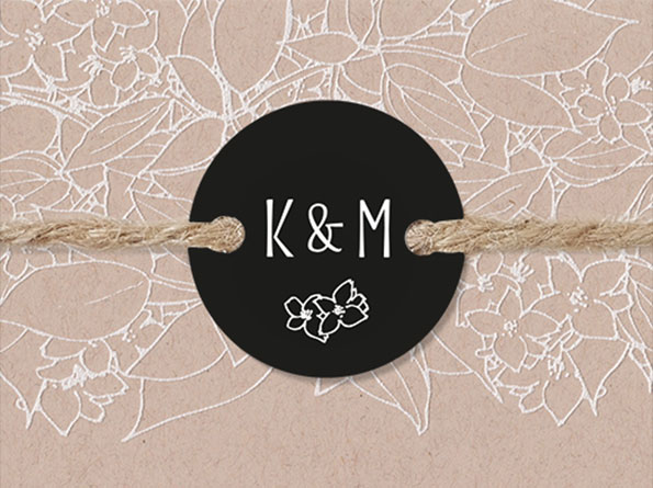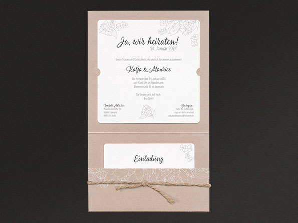 Die Karte klappt nach unten auf und gibt den Blick auf den cremefarbenen, fein strukturierten Naturkarton frei, der für Eure Einladungstexte und ein Zusatzkärtchen genutzt wird. Ein besonderes Highlight ist die Natur-Kordel, die die Karte verschließt und an der ein kleiner, runder Anhänger befestigt wird. Ihr könnt diesen Anhänger mit Euren Initialen, dem Hochzeitsdatum oder einem anderen liebevollen Detail personalisieren.