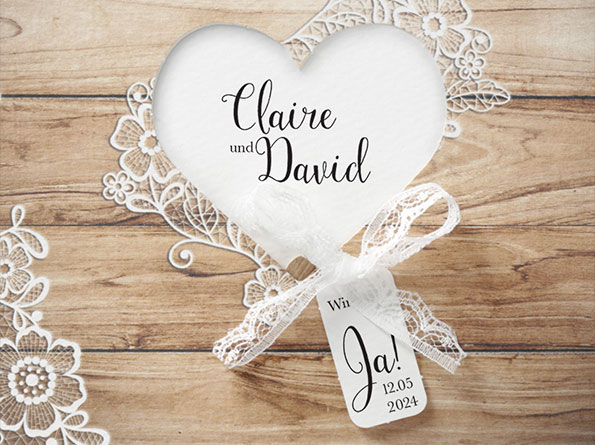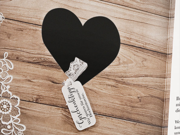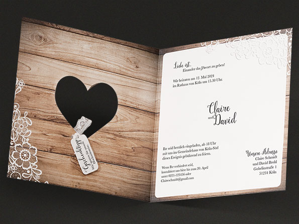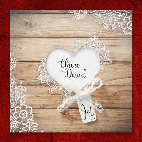 Besondere Details wie ein gestanztes Herz als Sichtfenster und eine anknüpfbare Spitzenschleife verleihen den Karten zusätzlichen Charme. Zwei kleine Anhänger sorgen für einen liebevollen Extra-Akzent, der das rustikale Design abrundet.