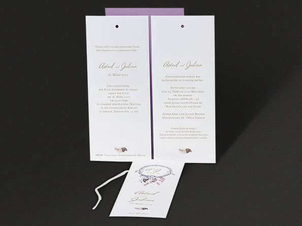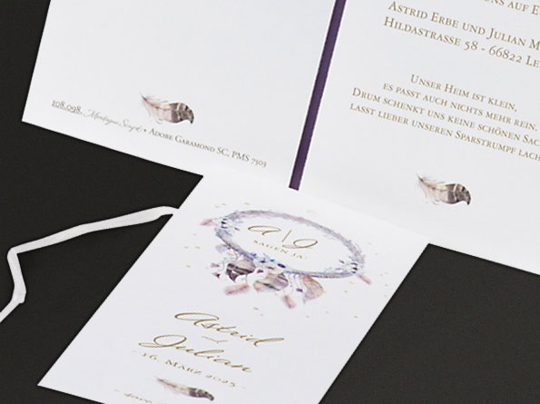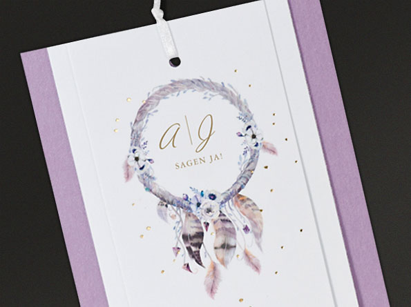 Ladet doch mit dieser vierteiligen Fächerkarte im Bohemian-Style zu Eurer romantischen BoHo-Hochzeit ein. Diese Hochzeitseinladungen bestehen aus drei cremefarbenen Karten, welche alle wichtigen Einladungstexte enthalten und einem aus fliederfarbenen Metallic-Karton gefertigten Rückteil. Die einzelnen Kartenteile werden durch ein Satinbändchen zusammengehalten. Auf dem etwas kleiner gehaltenen ersten Kärtchen ist bereits ein luftiger Traumfänger abgebildet, der von kleinen, in Gold-Foliendruck ausgeführten Punkten „umflogen“ wird. Die restlichen Texte können frei nach Euren Wünschen gestaltet und gedruckt werden.