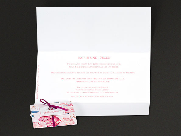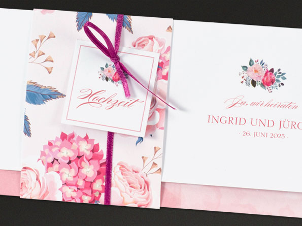 Romantisch-verspielte Einladungskarten zur Hochzeit im Garten. Aufgeklappt werden diese Hochzeitseinladungen nach oben und unten, eine Banderole dient als Verschluss. Durch ein schmales Satin-Bändchen kann ein kleines Kärtchen an eben diese Banderole angeknüpft werden. In Wasserfarben-Anmutung aufgedruckte Rosen, Hortensien und andere Pflanzen verleihen diesen Pocket-Karten ihre frische, luftige Erscheinung.